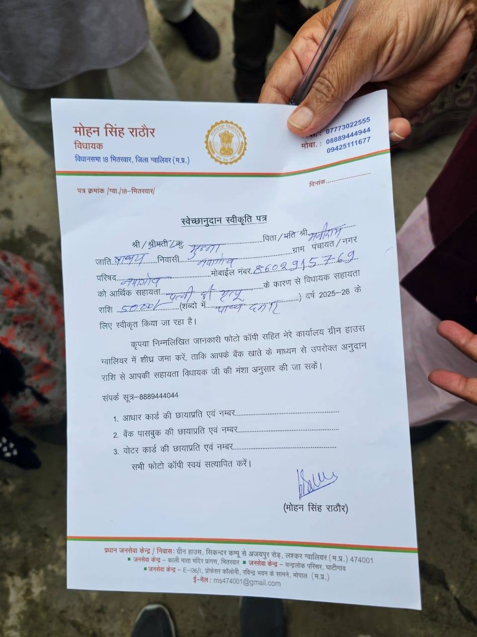 विधानसभा भितरवार #ग्राम_नयागांव में श्री खैमा बाथम जी के सुपुत्र स्व. राजू बाथम जी के सड़क दुर्घटना में आकस्मिक निधन की सूचना मिलने पर उनके निवास पहुंच कर शोक संवेदना व्यक्त की एवं संवल योजना अंतर्गत ₹4,00,000 का स्वीकृत पत्र प्रदान किया एवं विधायक निधि से ₹10,000 की आर्थिक सहायता राशि दी साथ ही श्री मुन्ना बाथम जी की पत्नी के निधन पर भी उनके निवास पहुंचकर श्रद्धांजलि अर्पित कर विधायक निधि से ₹5,000 की आर्थिक सहायता प्रदान की। ईश्वर दिवंगत आत्माओं को शांति एवं परिजनों को इस दुख की घड़ी में धैर्य प्रदान करें