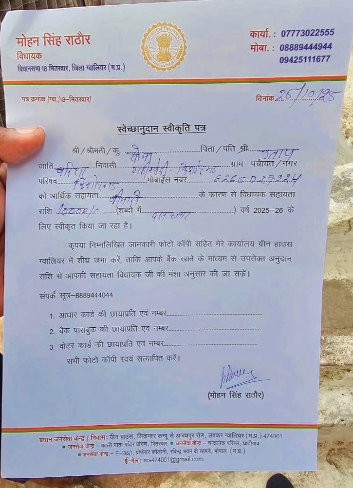 विधानसभा भितरवार ग्राम गडीखेरी में श्री उदल सिंह परिहार जी के स्वास्थ्य खराब होने की सूचना प्राप्त होते ही उनके निवास पहुंचकर उनके स्वास्थ्य की जानकारी ली एवं उनके उपचार के लिए विधायक निधि से ₹10,000 की आर्थिक सहायता राशि का चेक प्रदान किया। ईश्वर से उनके शीघ्र स्वस्थ होने की कामना