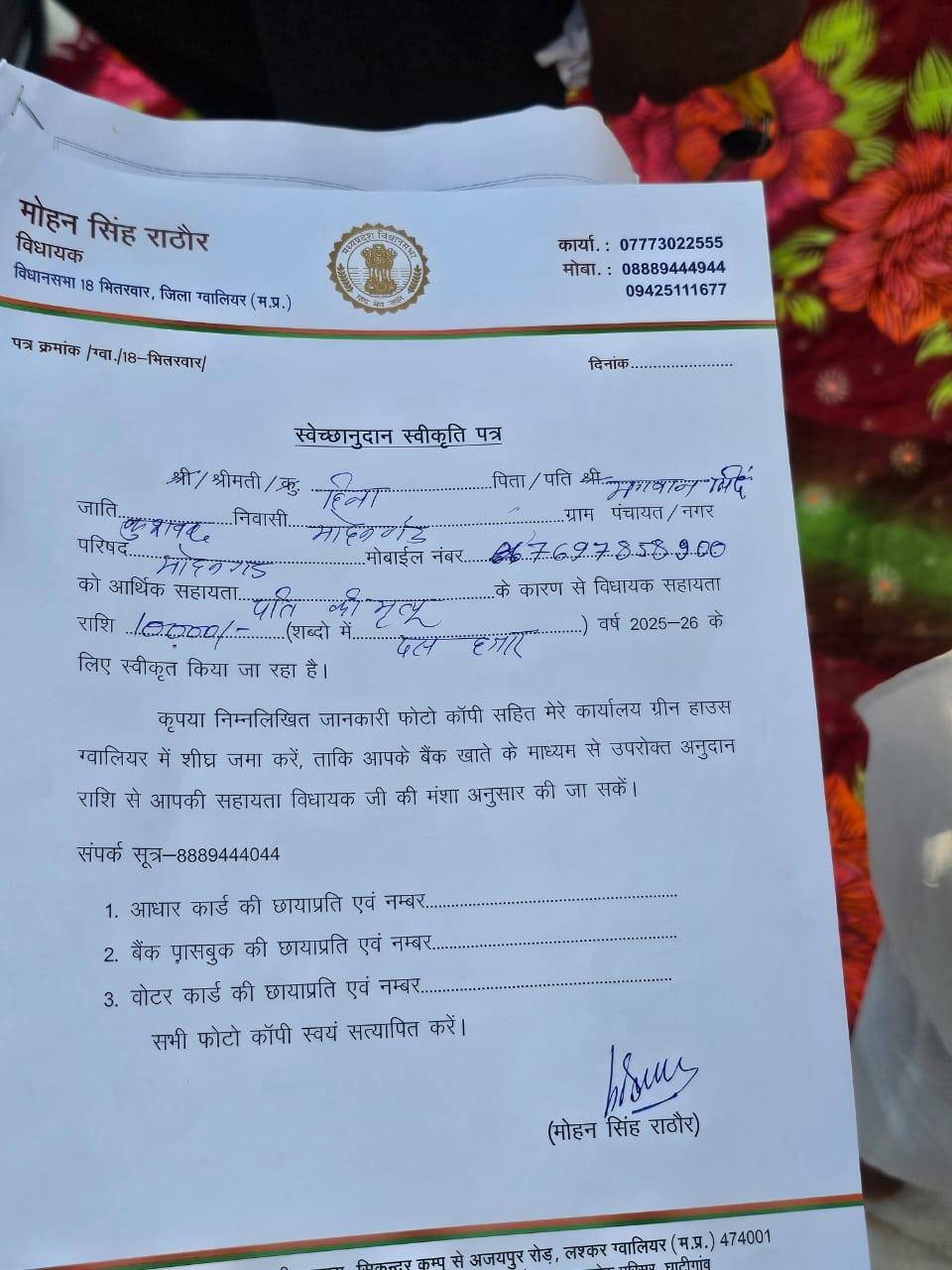 विधानसभा भितरवार ग्राम मोहनगढ़ में श्री सुरेश कुशवाह जी सुपुत्र स्व.श्री भगवान सिंह कुशवाह जी के निधन पर उनके निवास पर पहुँचकर शोक संवेदना व्यक्त की एवं परिवार को विधायक स्वेच्छानुदान निधि से 10000 रूपए की राशि लेटर द्वारा प्रदान की एवं श्री मातादीन बाथम जी के दादाजी के निधन पर उनके निजनिवास पहुंच कर शोक संवेदना व्यक्त कि साथ ही ग्रामवासियों द्वारा बताई गई संबंधित समस्या को गंभीरता से सुनकर समाधान हेतु संबंधित अधिकारियों से चर्चा कर निराकरण करने का आश्वासन दिया। ईश्वर से प्रार्थना है कि दिवंगत आत्मा को अपने श्रीचरणों में विश्रांति प्रदान करें