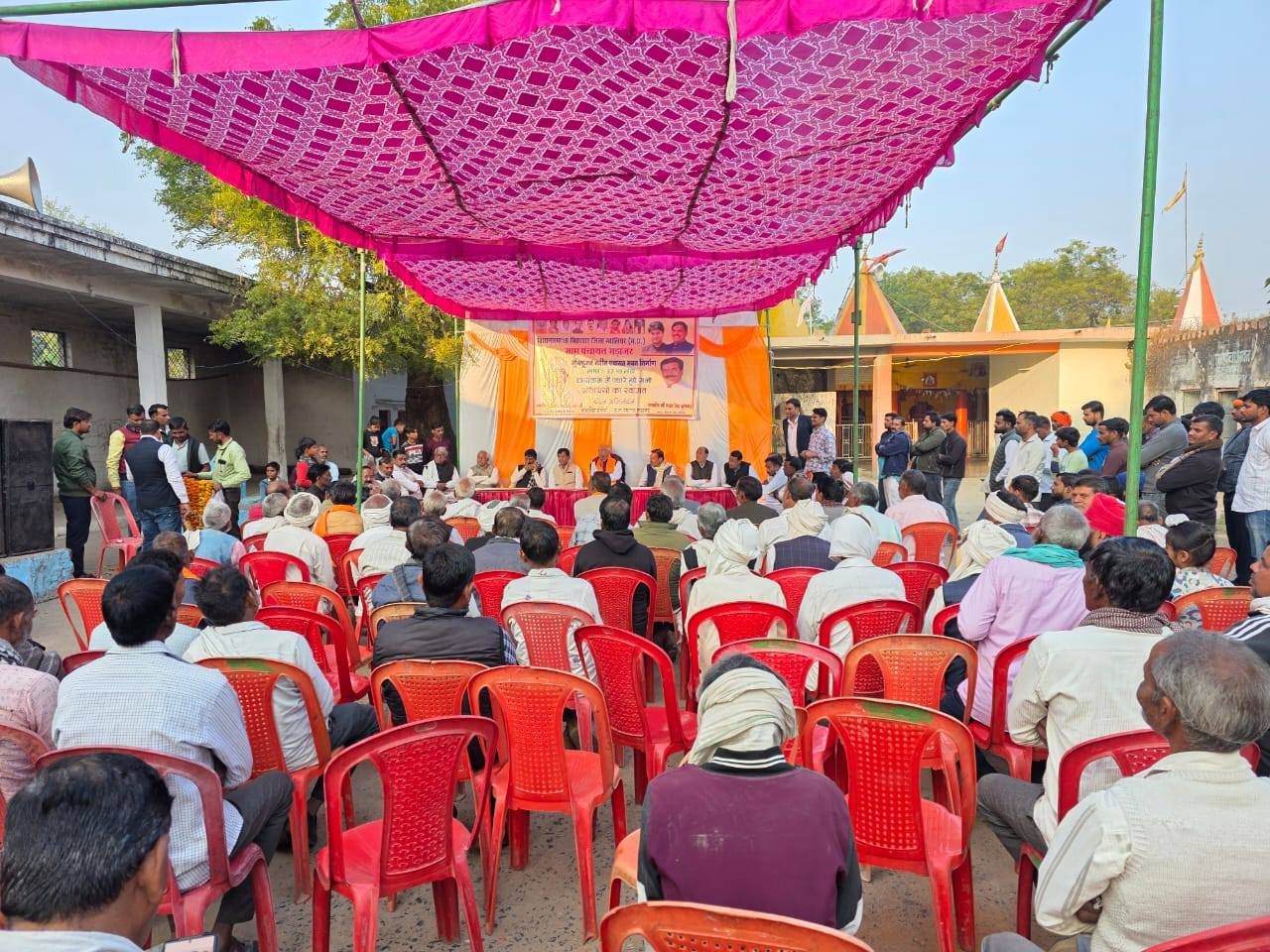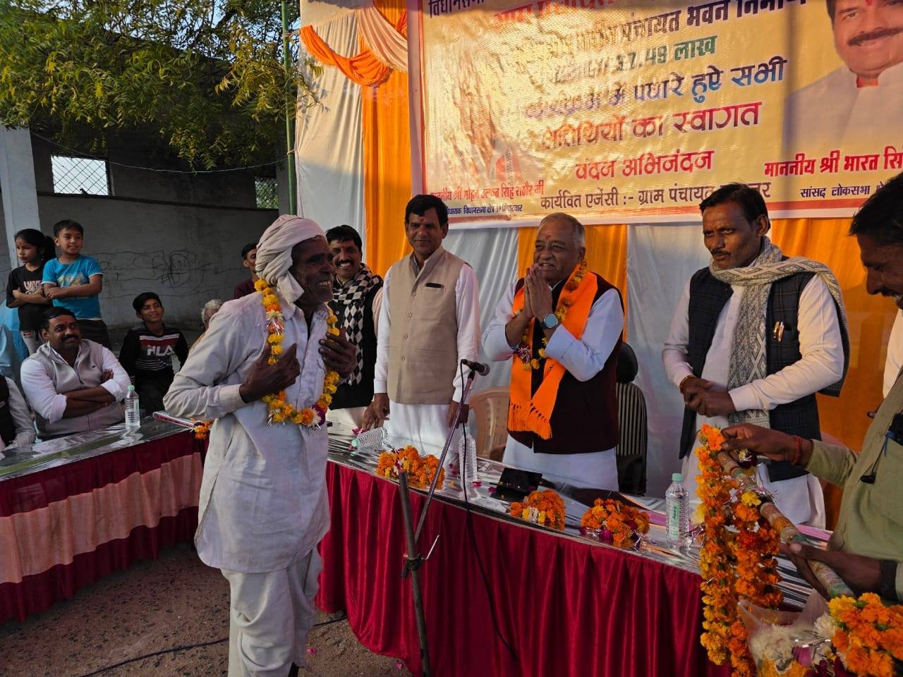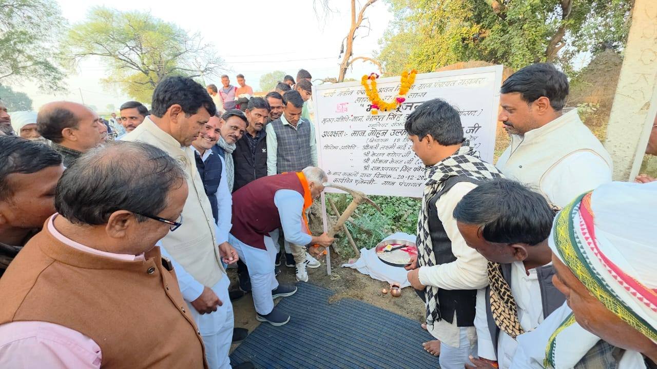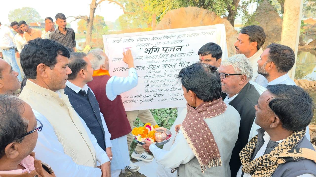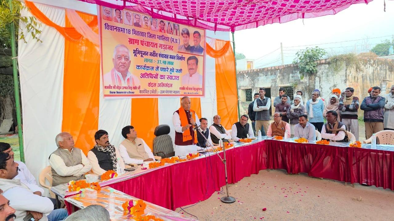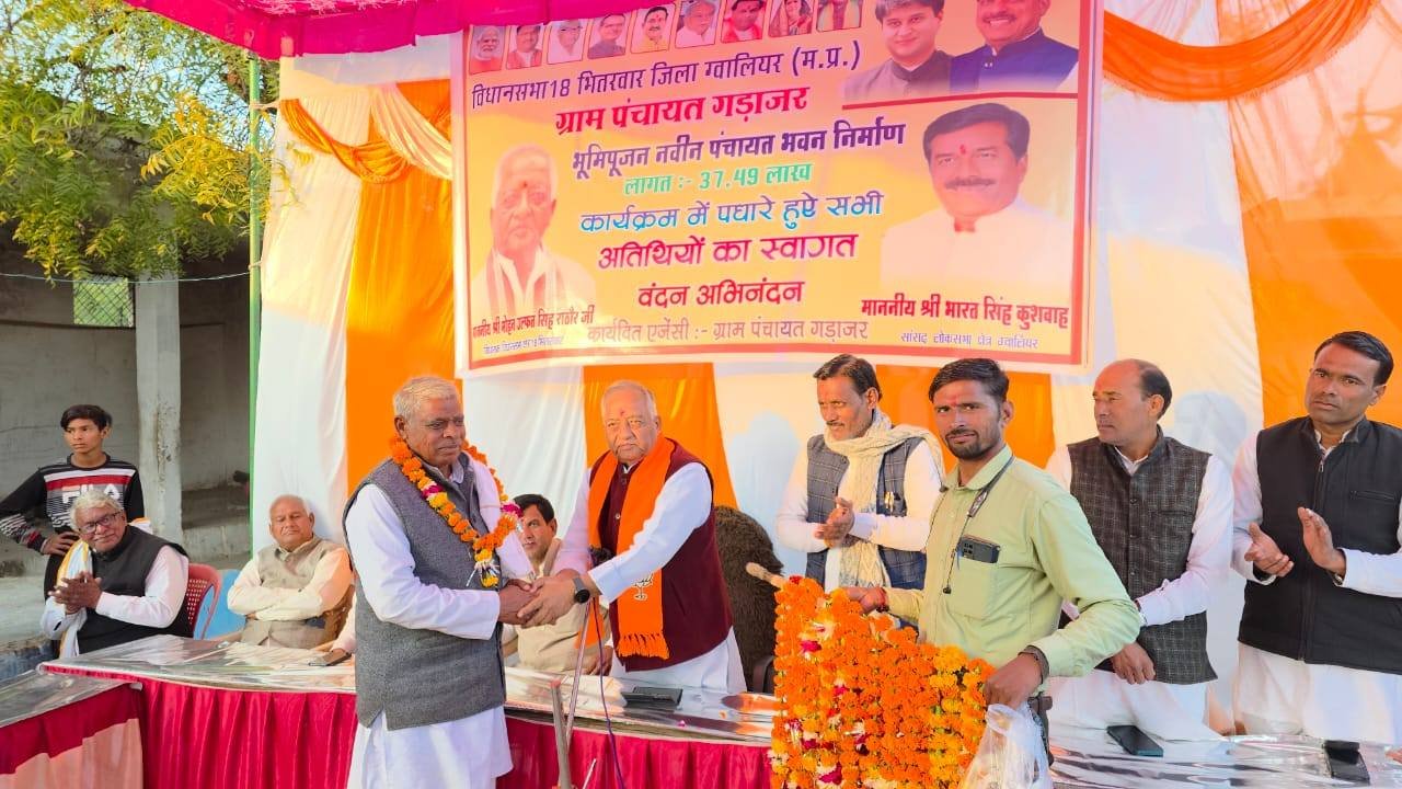 विधानसभा भितरवार ग्राम गड़ाजर में 37.49 हजार रुपए की लागत से बनने वाले नवीन पंचायत भवन निर्माण का विधिवत भूमि पूजन कर विकास कार्यों की नई और सशक्त शुरुआत की। इस अवसर पर जनसमस्याओं पर संवाद, सुझाव और समाधान को लेकर सार्थक चर्चा हुई एवं विधानसभा भितरवार क्षेत्र में करोड़ों रुपए के किए जा रहे विकाश कार्यों के बारे में ग्रामीणों को अवगत कराया एवं ग्रामीणों की समस्याएँ ध्यानपूर्वक सुना एवं त्वरित निराकरण का भरोसा दिलाया । यह पंचायत भवन भविष्य में जनसेवा, पारदर्शिता और ग्राम विकास का एक मजबूत एवं सशक्त केंद्र सिद्ध होगा। इस अवसर पर श्री रामेश्वर रावत जी (मंडल अध्यक्ष),श्री नारायण जाटव जी (जनपद अध्यक्ष),श्री केशव बघेल जी (जिला पंचायत सदस्य),श्री रामअवतार पवैया जी (सरपंच),श्री मोनू गुर्जर जी (सरपंच),श्री जनक सिंह तोमर जी (सरपंच),श्री भीकम केवट जी (जनपद सदस्य),श्री भीकम सिंह जाट जी,श्री उदयभान सिंह रावत जी,श्री कल्लू रावत जी,श्री नरेश अग्रवाल जी,श्री माधौ कुशवाह जी,श्री राहुल पवैया जी,श्री गिरिराज राठौड़ जी,श्री पंजाब पवैया जी,श्री टिंकू राठौड़ जी,श्री बंटी गुर्जर जी,श्री कालू रावत जी,श्री बॉबी रावत जी सहित बड़ी संख्या में ग्रामवासी एवं कार्यकर्ता उपस्थित रहे।