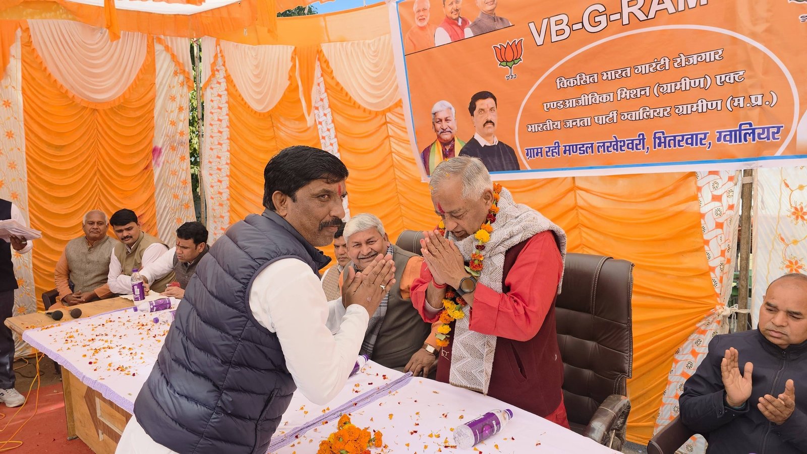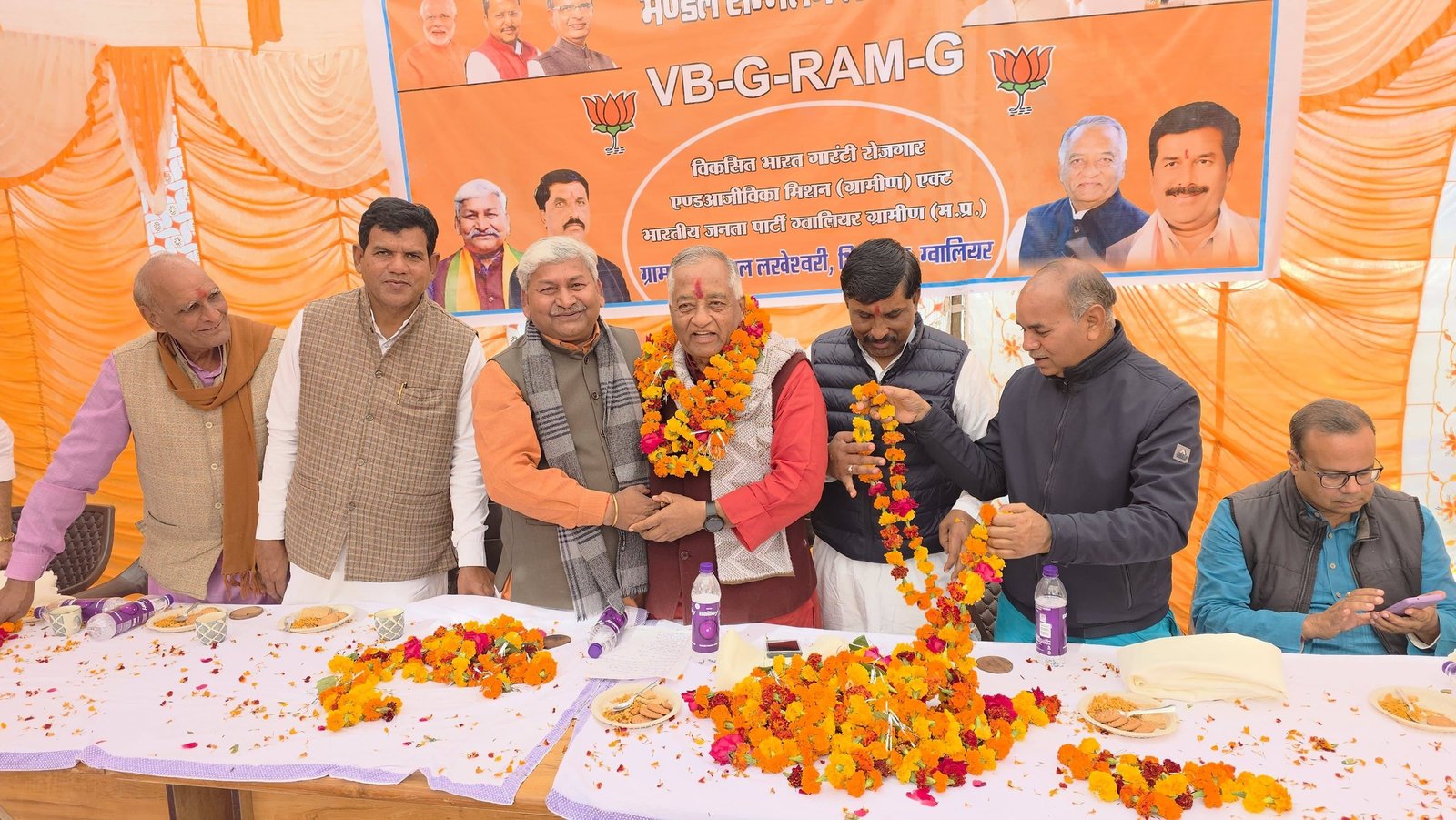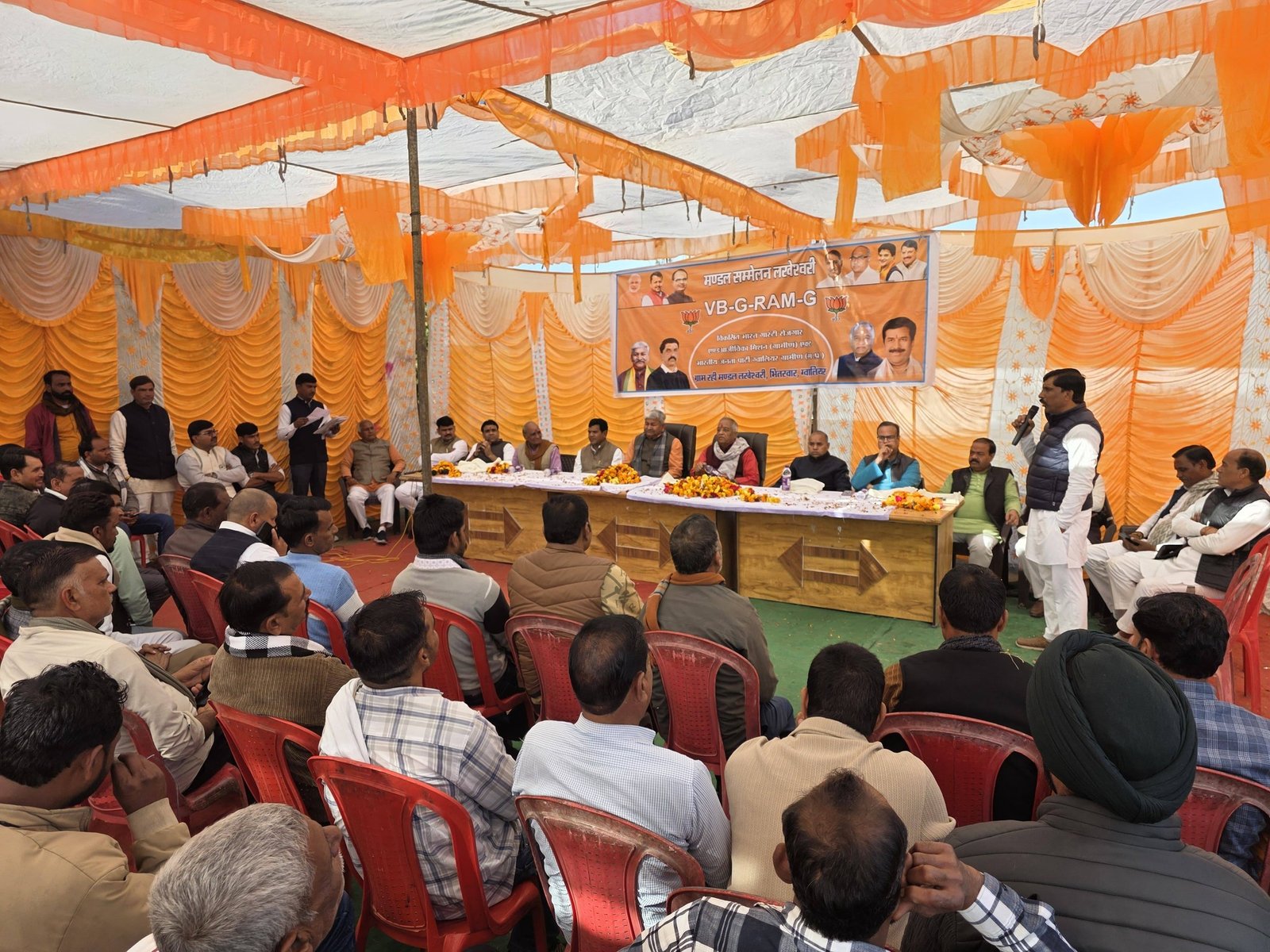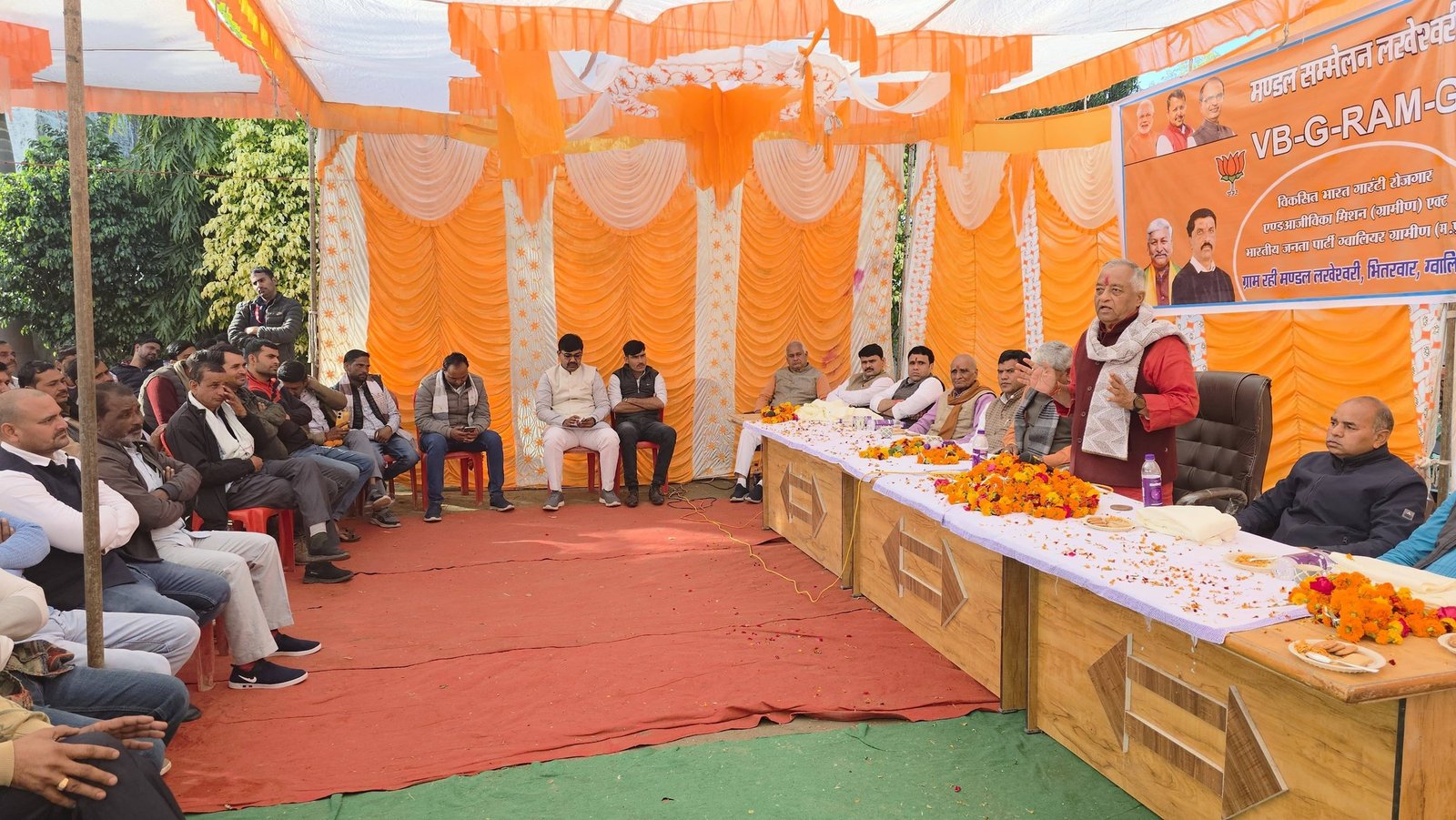 विधानसभा भितरवार ग्राम रही में लखेश्वरी मंडल सम्मेलन (VB-G-RAM-G — विकसित भारत गारंटी रोजगार एवं आजीविका मिशन ग्रामीण एक्ट) के गरिमामय कार्यक्रम में सम्मिलित होकर कार्यक्रम के शुभारंभ में महापुरुषों के चित्र पर पुष्प अर्पित कर एवं दीप प्रज्वलन के साथ उपस्थित कार्यकर्ताओं द्वारा आत्मीय स्वागत किया इस अवसर पर सम्मानित वक्ताओं के विचारों को सुना एवं तत्पश्चात अपने विचार रखते हुए ग्रामीण विकास, रोजगार और आजीविका सशक्तिकरण के विषय पर चर्चा की। इस अवसर पर श्री प्रेम सिंह राजपूत (जिला अध्यक्ष भाजपा), श्री अमिताभ सिंह हरसी, श्री मुकेश भार्गव जी (VB-G-RAM-G विधानसभा प्रभारी), श्री रामेश्वर रावत जी (मंडल अध्यक्ष), श्री सुरेश उपाध्याय जी, श्री केशव बघेल जी (जिला पंचायत सदस्य), श्री नारायण जाटव जी (जनपद अध्यक्ष), श्री कुँवर सिंह जी, श्री भीकम सिंह जाट जी, श्री जितेंद्र रावत जी, श्री हेमंत रावत जी, श्री परशुराम पवैया जी, श्री उदयभान सिंह रावत जी, श्री महीप यादव जी, श्री अंशुमान खेनवार जी, श्री राजेश मंडेलिया जी,श्रीमती मुन्नी परमार जी सहित अनेक कार्यकर्ता एवं गणमान्यजन उपस्थित रहे।
