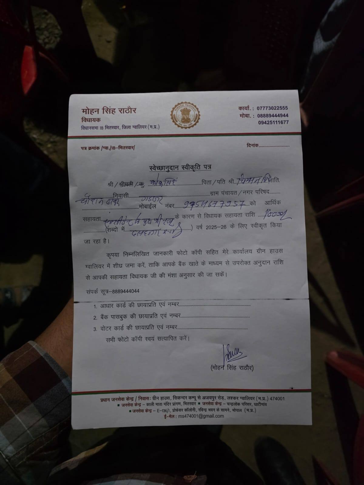 विधानसभा भितरवार ग्राम गडाजर में श्री कोक सिंह चौहान जी के सुपुत्र के दुःखद देहांत की सूचना प्राप्त होने पर उनके निवास पहुँचकर शोक संवेदना व्यक्त की। इस दुःखद घड़ी में परिवारजनों से भेंट कर उन्हें सांत्वना दी तथा विधायक निधि से ₹10,000 की सहायता राशि का स्वीकृति पत्र प्रदान किया। ईश्वर दिवंगत आत्मा को शांति प्रदान करें एवं शोकाकुल परिवार को इस अपार दुःख को सहन करने की शक्ति दें