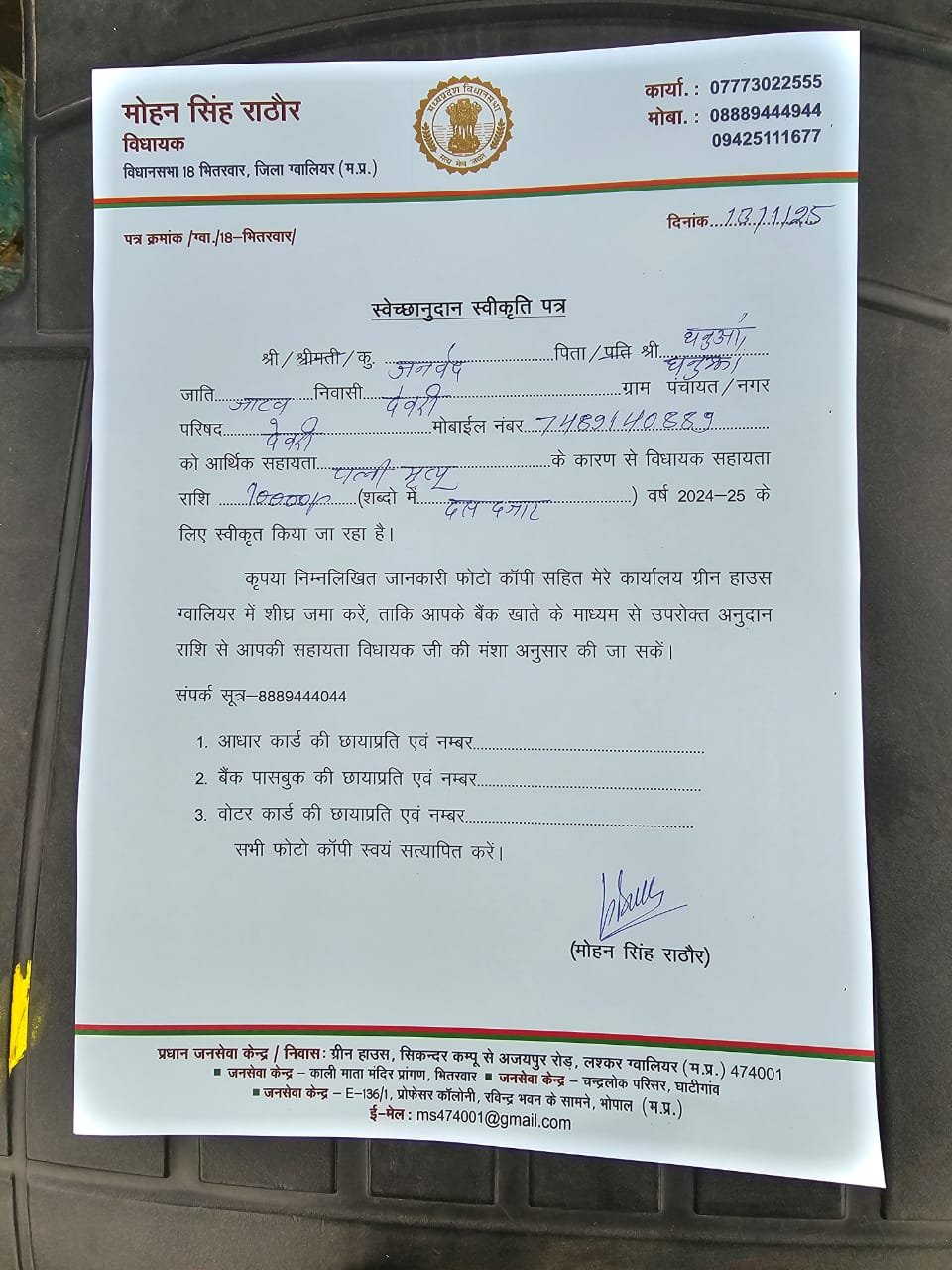 विधानसभा भितरवार ग्राम देवरीकला में श्री जनवेद जाटव जी की पत्नी एवं श्री ठकुरीराम जाटव जी की माताजी के देहांत हो जानें की सुचना मिलने पर उनके निजनिवास पहुंच कर परिवारजनों से मुलाक़ात कर शोक सवेदना प्रकट की एवं छोटी सी सहायता राशि विधायक स्वेच्छानुदान निधि से दोनों परिवारों को 10.10 हजार रूपए की राशि लेटर द्वारा प्रदान की एवं अधिकारियों से बात कर हर संभव मदद करने का आश्वासन दिया। ईश्वर पुण्यात्मा की शांति के लिए प्रार्थना की !