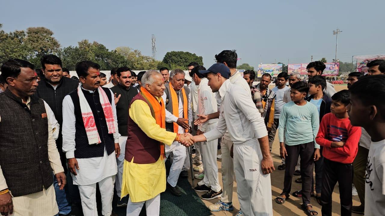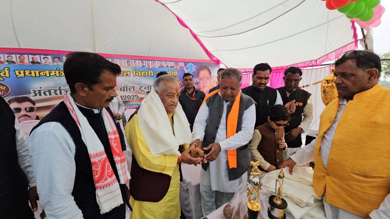 रामजानकी स्टेडियम मगरौनी में विधायक कप 2025 का भव्य आयोजन किया गया। मगरौनी के राम जानकी स्टेडियम में स्वर्गीय पूर्व प्रधानमंत्री श्री अटल बिहारी वाजपेयी जी की स्मृति में आयोजित अंतरराज्यीय लेदर बॉल टूर्नामेंट – विधायक कप 2025 के कार्यक्रम में बड़ी संख्या में जनप्रतिनिधियों और खेल प्रेमियों की उपस्थिति रही । इस अवसर पर विधायक श्री रमेश खटीक जी (करैरा), श्री नरेंद्र रावत जी (मंडल अध्यक्ष),श्री भवानी शंकर कोरकू जी (नगर परिषद अध्यक्ष), श्री जैंडल सिंह गुर्जर जी (नगर परिषद उपाध्यक्ष), श्री संतोष सिंह राजपूत जी (पार्षद), श्री कल्याण सिंह कुशवाह जी (पार्षद), श्री चेतन खटीक जी, श्री शीतल तोमर जी, श्री तारन सिंह तोमर जी (पार्षद), श्री किशन सिंह रावत जी, श्री भोला फौजी जी (सरपंच), श्री दिलीप खटीक जी (सरपंच), श्री भागेश गोयल जी एवं कार्यक्रम में भारतीय जनता पार्टी के कार्यकर्ता एवं जनसेवक साथी सम्मलित रहें। इस टूर्नामेंट का आयोजन युवा खेल प्रतिभाओं को प्रोत्साहित करने और खेल संस्कृति को बढ़ावा देने के उद्देश्य से किया गया। खिलाड़ियों को शुभकामनाएं देते हुए खेल भावना और टीमवर्क के महत्व पर बल दिया। उन्होंने स्वर्गीय श्री अटल बिहारी वाजपेयी के जीवन से प्रेरणा लेने और उनकी राष्ट्रसेवा भावना को आगे बढ़ाने का आह्वान किया।